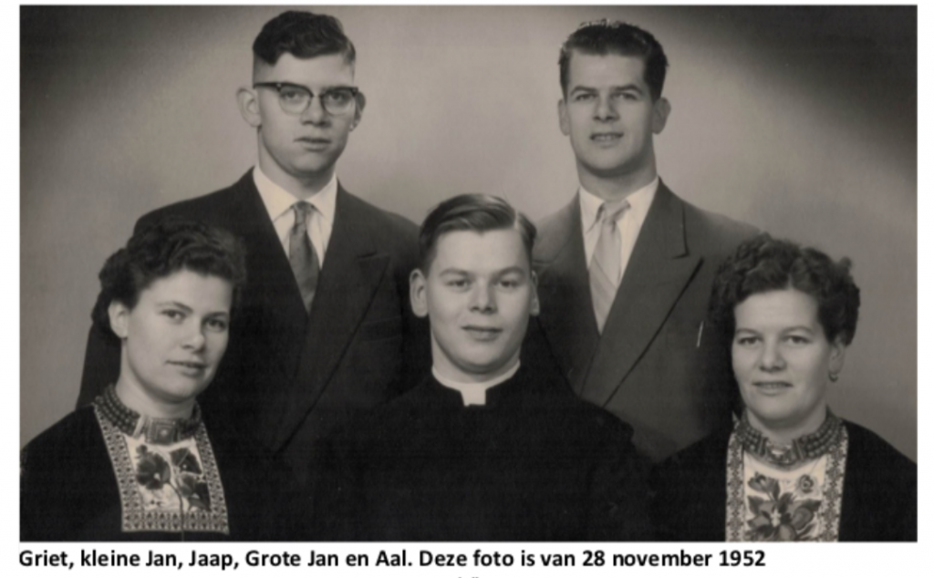 Jan {Kleine Jan} (*22041936/†30052005) was getrouwd met Aris Tol {Sas} (*16011933/†31102001). Jaap (23041937/†26091994). Hij was broeder. Zijn kloosternaam was Switbertus. Griet (*06091938) is gehuwd geweest met Bertus Zoetebier (*11011935/†08062004).